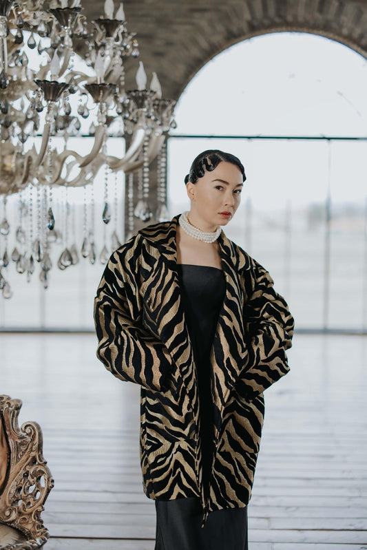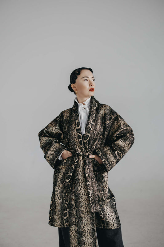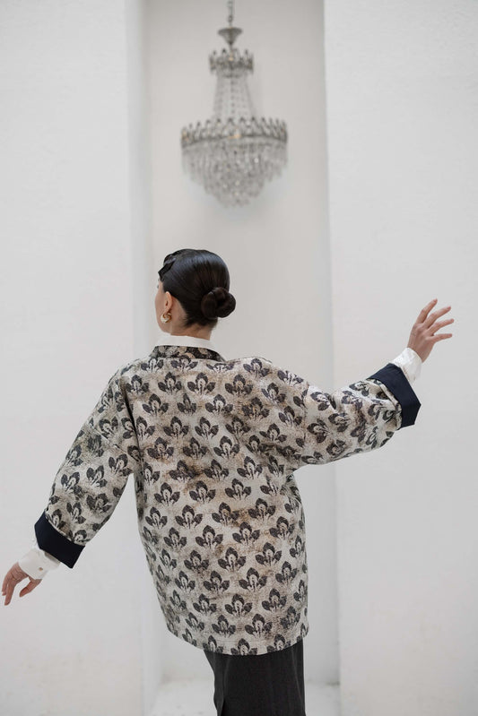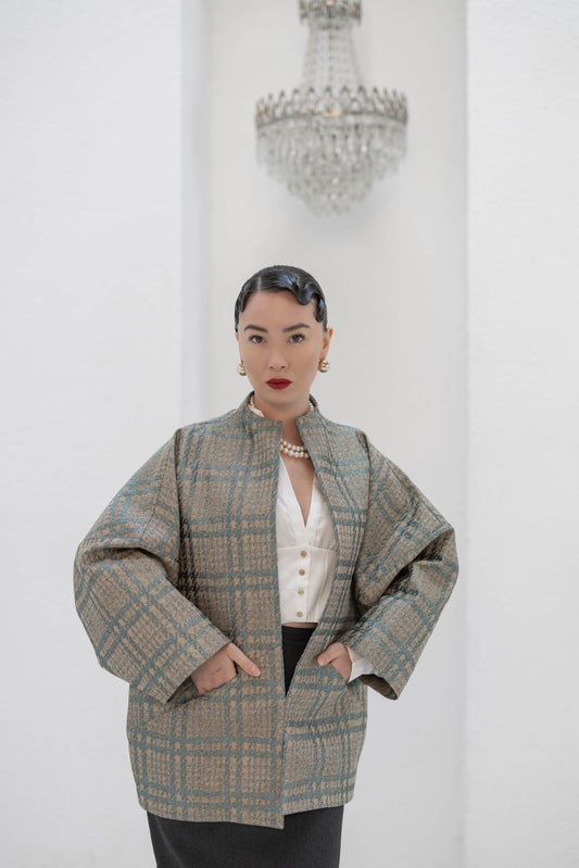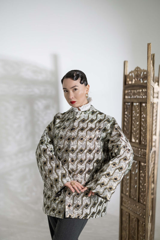 Discover the allure of our latest jacket, showcasing the captivating shade of petrol green enriched with intricate geometric patterns. Every stitch embodies a dance of style, color, and design, creating a harmonious masterpiece that stands out in any crowd. Elevate your wardrobe with this unique blend of elegance and individuality.
