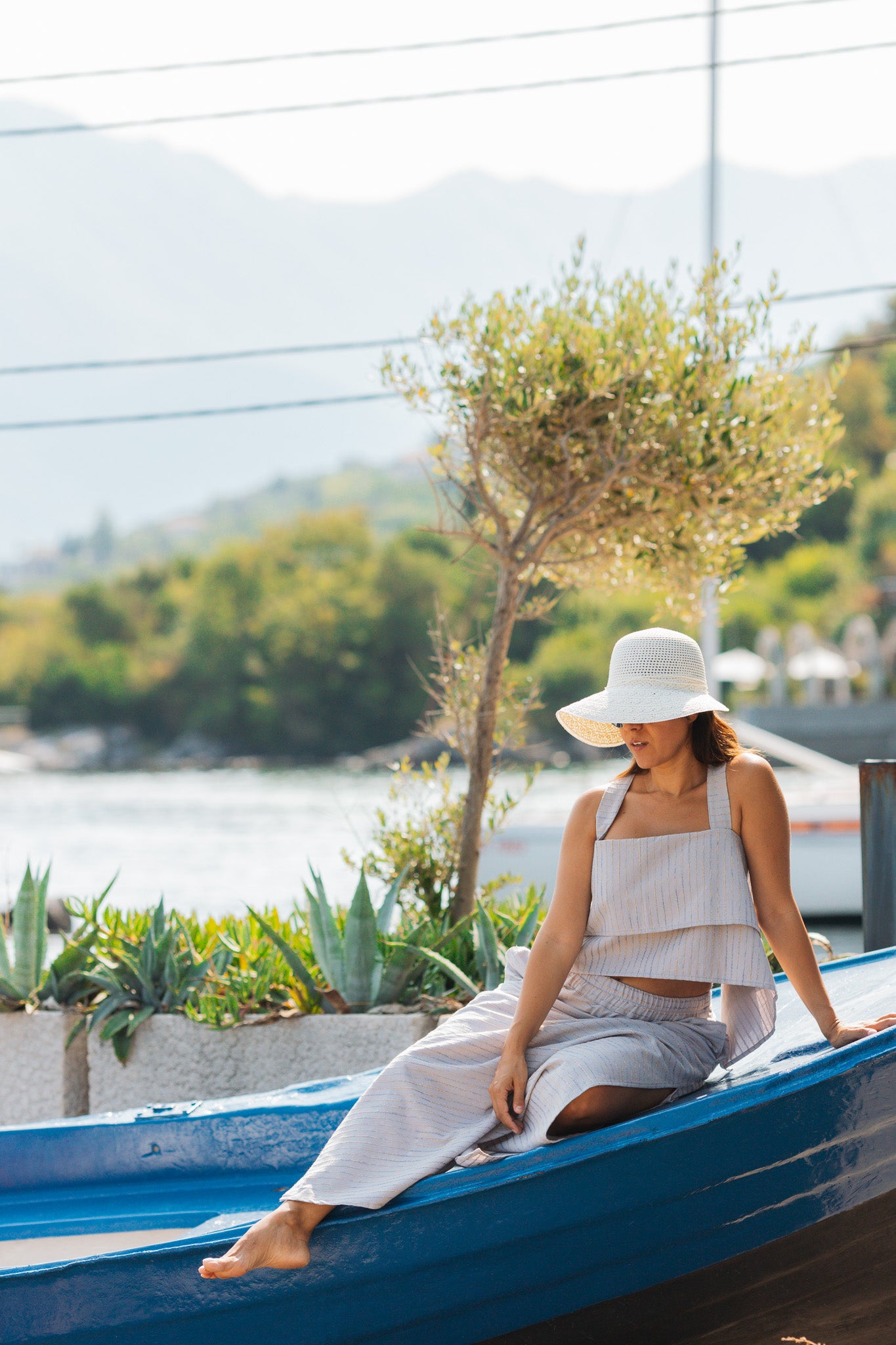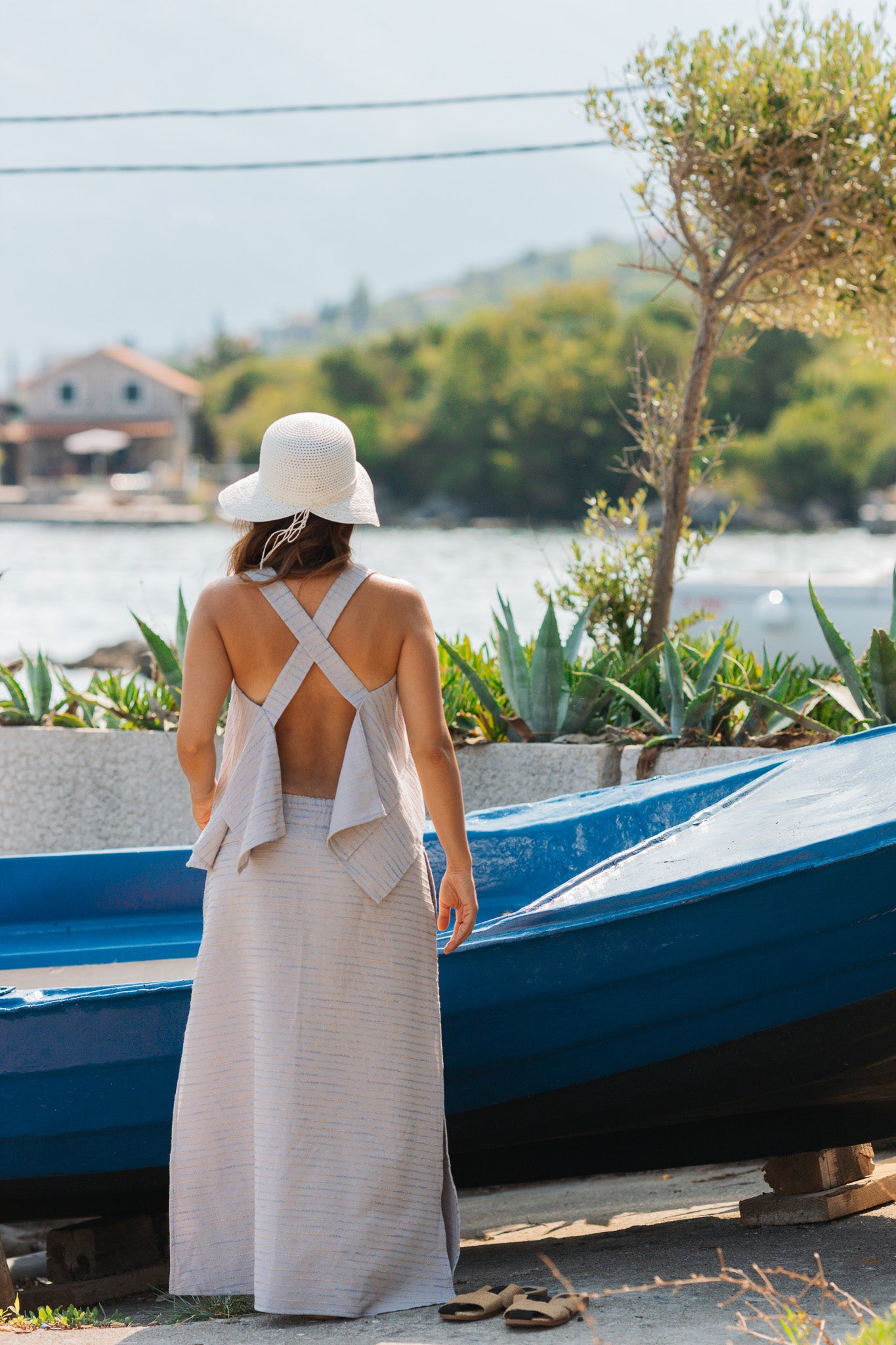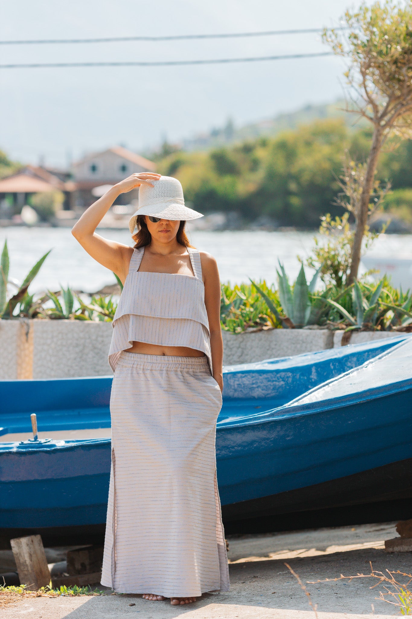 High-waisted 100% cotton skirt and cross-strap bustier set. The skirt features an elastic waistband, side pockets, and two slits for freedom of movement. The bustier comes with a square neckline, layered front, and wide crossover straps at the back. Lightweight, breathable, and perfect for hot summer days. Limited Edition, very few pieces available, ready to ship...